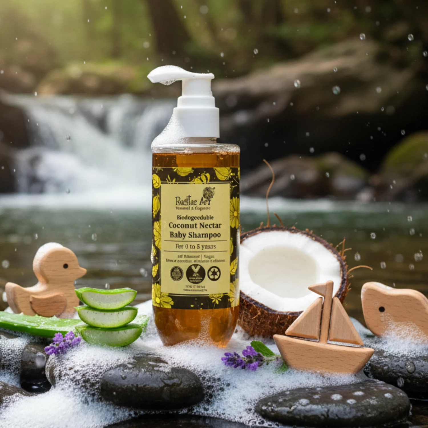 Baby shampoo has equal care from our end towards your baby as you would. Coconut nectar, amino proteins, multi vitamins and minerals; baby shampoo is fully loaded with the nourishment powerhouse with extremely mild fragrance ensuring a sound bath for the baby. Aloe Vera and betain make sure that your baby's scalp remains itch free and moisturized! Rustic art liquid shampoo is completely biodegradable. It has a unique amino acid based surfactant blend which is sustainably sourced from natural grains and sugarcane. This blend is super mild with excellent sensory attributes and is non stripping/drying. Requires less water to rinse off.