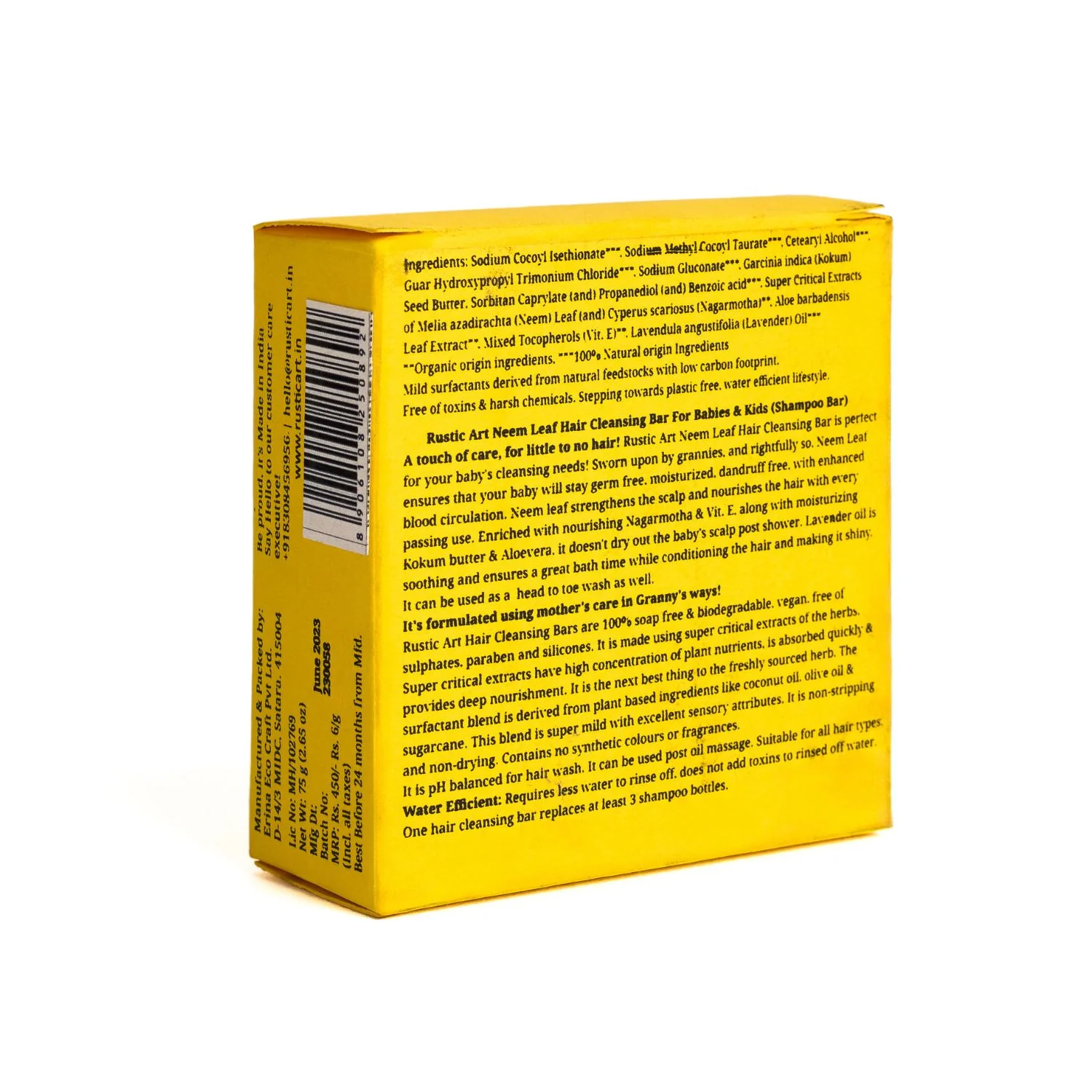A touch of care, for little to no hair! Rustic Art Neem Leaf Hair Cleansing Bar is perfect for your baby's cleansing needs! Sworn upon by grannies, and rightfully so, Neem Leaf ensures that your baby will stay germ free, moisturized, dandruff free, with enhanced blood circulation. Neem leaf strengthens the scalp and nourishes the hair with every passing use. Enriched with nourishing Nagarmotha Vit. E, along with moisturizing Kokum butter Aloevera, it doesn't dry out the baby's scalp post shower. Lavender oil is soothing and ensures a great bath time while conditioning the hair and making it shiny. It can be used as a head to toe wash as well. It's formulated using mother's care in Granny's ways! Rustic Art Hair Cleansing Bars are 100% soap free biodegradable, vegan, free of sulphates, paraben and silicones. It is made using super critical extracts of the herbs. Super critical extracts have high concentration of plant nutrients, is absorbed quickly provides deep nourishment. It is the next best thing to the freshly sourced herb. The surfactant blend is derived from plant based ingredients like coconut oil, olive oil sugarcane. This blend is super mild with excellent sensory attributes. It is non-stripping, non-drying, and safe for chemically treated coloured hair. The bar contains no synthetic colours or fragrances. It is pH balanced for hair wash. It can be used post oil massage. Suitable for all hair types. Water Efficient: Requires less water to rinse off, does not add toxins to rinsed off water. One hair cleansing bar replaces at least 3 shampoo bottles. To Use: Rub wet palms against the hair cleansing bar to lather. Massage. Rinse. After use, store the bar upright in a dry place for longer lasting product. Good hair day, everyday!