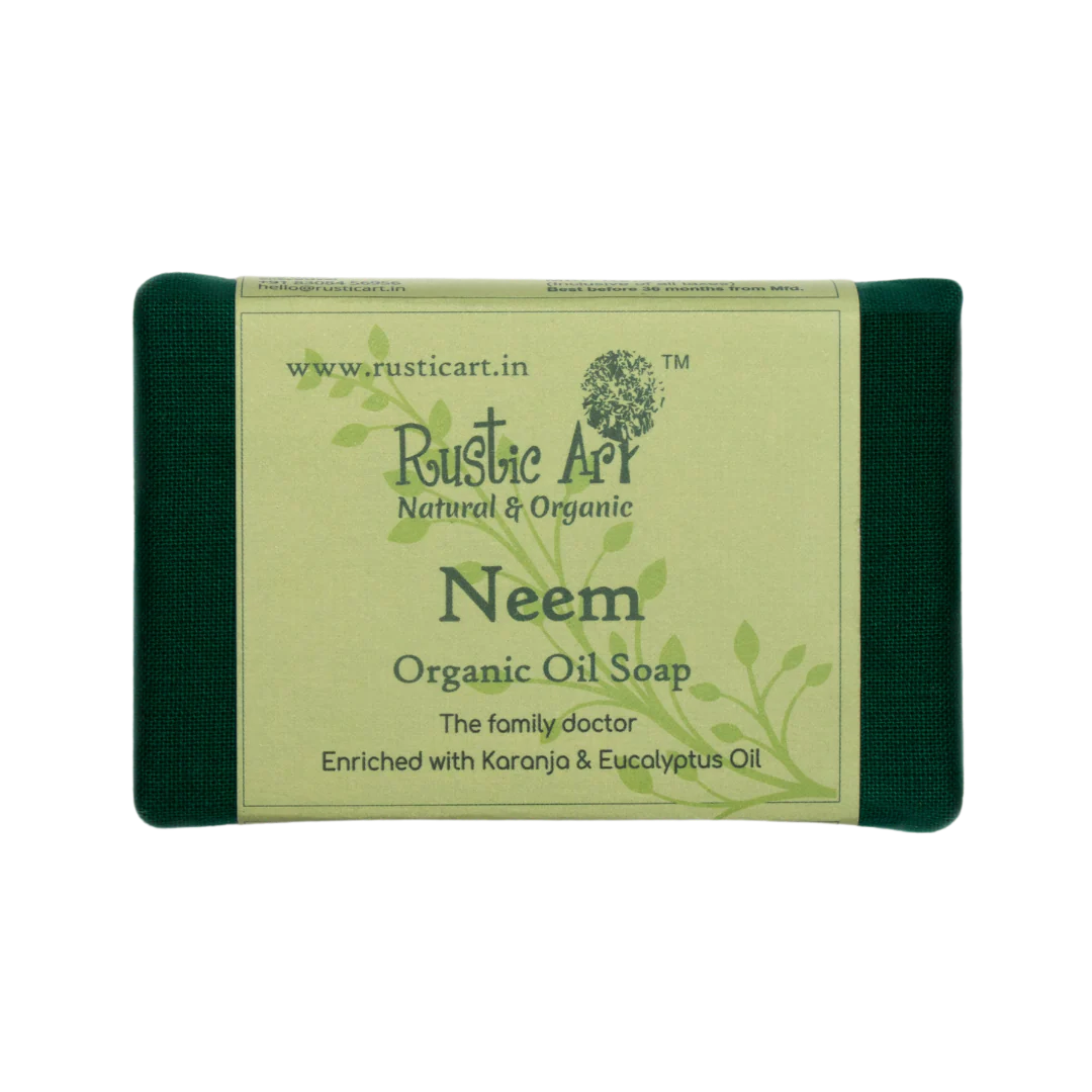 Rustic Art Organic Neem Soap is a cold-processed, antibacterial soap for sensitive skin. Made with certified organic neem, basil, eucalyptus, and lemongrass oils, this 100gm bar provides gentle cleansing with natural antifungal and anti-acne benefits.