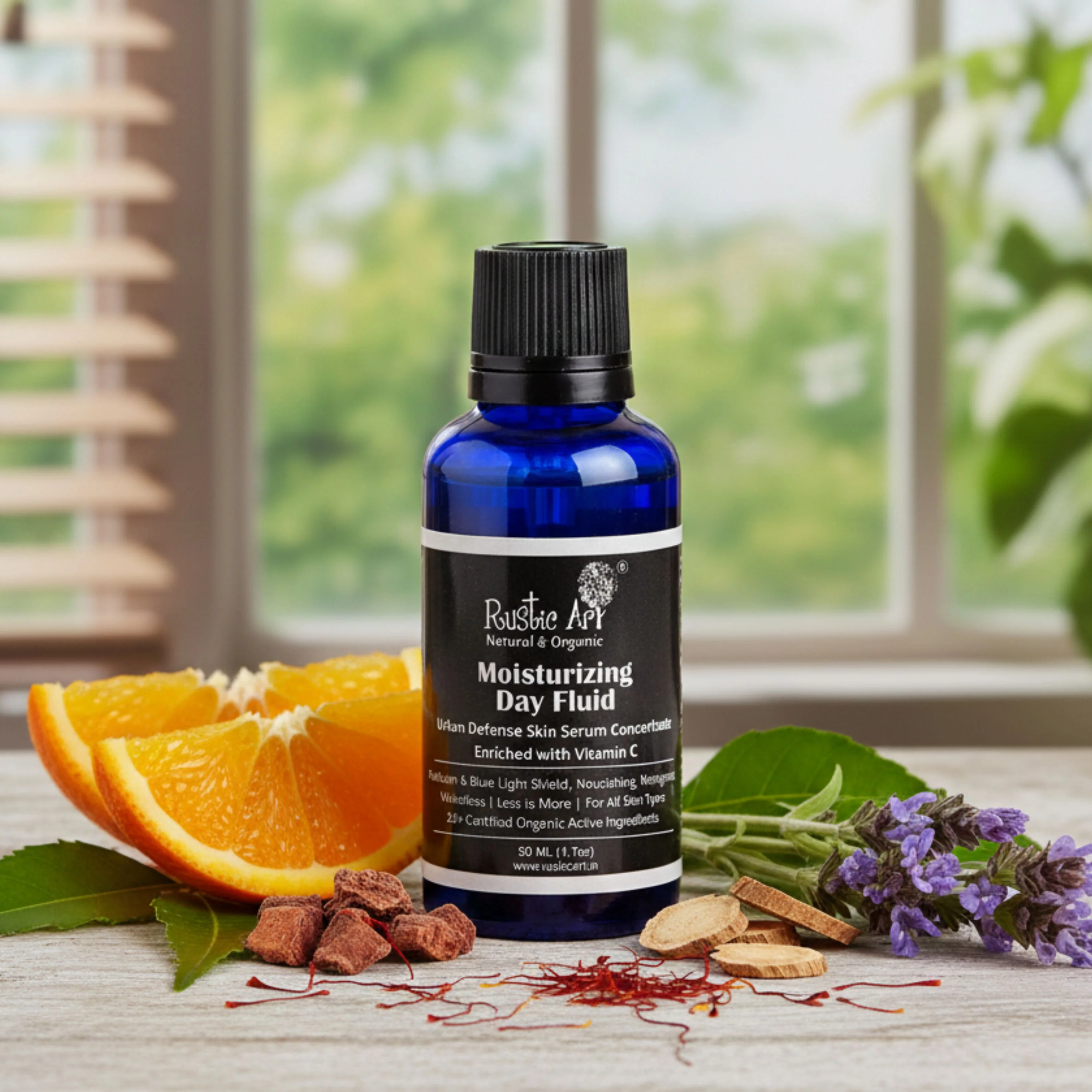 Ever woke up to a sleepy head? A sleepy skin? Now awaken your skin with the rustic art moisturizing day fluid for urban defense. Fight the pollution and stresses of the day away with over 20 active organic ingredients. A fluid that replaces all the creams and lotions with its non-greasy formula to combat the stressors like blue light from the screens. It forms a water proof shield on your face to nourish it while keeping it look fresh all day long. Super critical extract of Ashwagandha is the joker of the suite. It helps the skin against blue light pollution caused by computer’s and phone’s screen. It fights off the blue lights’ radiation that the modern world is subjected to the most part of the day! Accompanied with manjistha, keshar (saffron) and neem, it fights off itchiness, irritation, inflammation while detoxifying the skin simultaneously. All the oils in the day fluid are cherry picked to moisturize both the oily and dry skin with ease. The red raspberry seed oil is a natural sun screen. It is known to increase the SPF while letting your skin breathe. Moringa and hemp seed oil protect the skin against the free radicals which are most active in sunlight. They also keep the skin wrinkle free and reduce the signs of aging. Jojoba oil teams up with red raspberry to fight the damages caused by the UV rays. Jojoba is extensively used in treating sun burns and as a sun screen. Almond oil, coconut oil and carrot seed oil provide with the most essential nourishment required for the skin. They add a glow to the skin while boosting blood flow. They’re excellent at retaining moisture in the skin and help soothe the skin irritation and inflammation. Multivitamins keep the skin young and nourished at the same time. All of this is topped by sweet citric fragrances of cypress, clarysage and sweet orange that linger throughout the day to uplift your senses. A perfect combination for all day nourishment and protection. Experience the healthy and glowing skin from the first application as 20+ certified organic active ingredients with certified organic silicone alternative made from vegetable oils, work together for better, faster results. Rustic Art’s fluid range is concentrate series of water efficient products. It has no fillers, no water, and spreads easily. Suitable for all skin types. It can be applied on arms, face and neck. It is free from silicones, mineral oil, preservatives, parabens and any other toxic ingredient. Pollution is on the rise, daily. Skin is the first thing that people notice, make it worthwhile with Rustic Art Moisturizing Day Fluid!