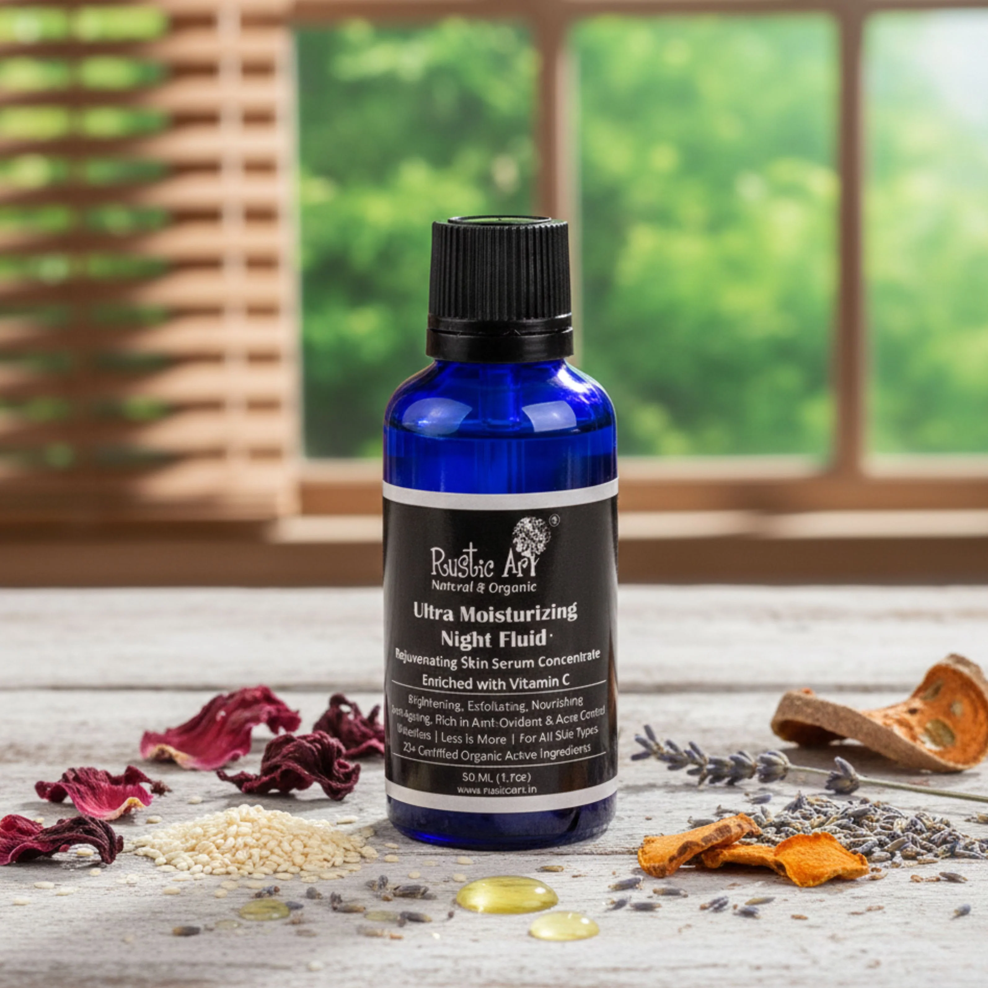 All you need is love! And a good night’s sleep. Now nourish your skin while sleeping and fall in love with your skin again with rustic art organic ultra moisturizing night fluid. An intelligent formula to detect the skin issue like ageing, dark spots, fine lines, acne, large pores and wrinkles to name a few and repair the skin so you can put your best face forward. It moisturizes the skin, give a natural glow and repair any deep tissue damages caused to the skin. All of this, with a soothing fragrance which helps relax the senses and induce calm sleep. The ultra moisturizing night fluid is loaded with tons of cold pressed, non-greasy oils and their benefits. As body heals faster during nights and has no natural stresses to fight, night fluid is formulated to heal and repair the damages caused to the skin during the day. Vitamin C gently exfoliates the skin and brightens it from within. Super critical extracts of Amla and hibiscus tighten the pores keeping the skin firm. Licorice oil helps to fight the darkening of the skin due to exposure to the UV rays to even tone the skin. Turmeric oil reduces tan, and inflammation and acts as antiseptic. It is also anti bacterial, anti fungal and anti microbial in nature keeping all the skin irritations in check and keep acne causing germs away. Geranium, palmrosa and hemp seed oil balances the natural oils of the skin and helps fight the sebum build up. Lavender oil is known to calm down the mind and enhance emotions. A perfect way to go off to sleep and wake up fresh to a new day. Sesame oil, almond oil and coconut oil do the heavy lifting in the nourishing department. Hemp and moringa oil help exfoliate the skin, fight the wrinkles and balance the skin oils and sebum build up. Sunflower oil rich in multivitamins help regenerate the damaged skin cells. Flax seed oil and Shea oil together help to even out the skin tone and keep the skin soft and supple. Multivitamins act as anti oxidants and nourish the skin while keeping the skin young. Experience the brighter and healthy skin first application as 20+ certified organic active ingredients with certified organic silicone alternative made from vegetable oils, work together for better, faster results. Rustic Art’s fluid range is concentrate series of water efficient products. It has no fillers, no water, and spreads easily. Suitable for all skin types. It can be applied on arms, face and neck. It is free from silicones, mineral oil, preservatives, parabens and any other toxic ingredient. Pollution is on the rise, daily. Wake up to a healthy face, daily with Rustic Art Ultra Moisturizing Night Fluid!