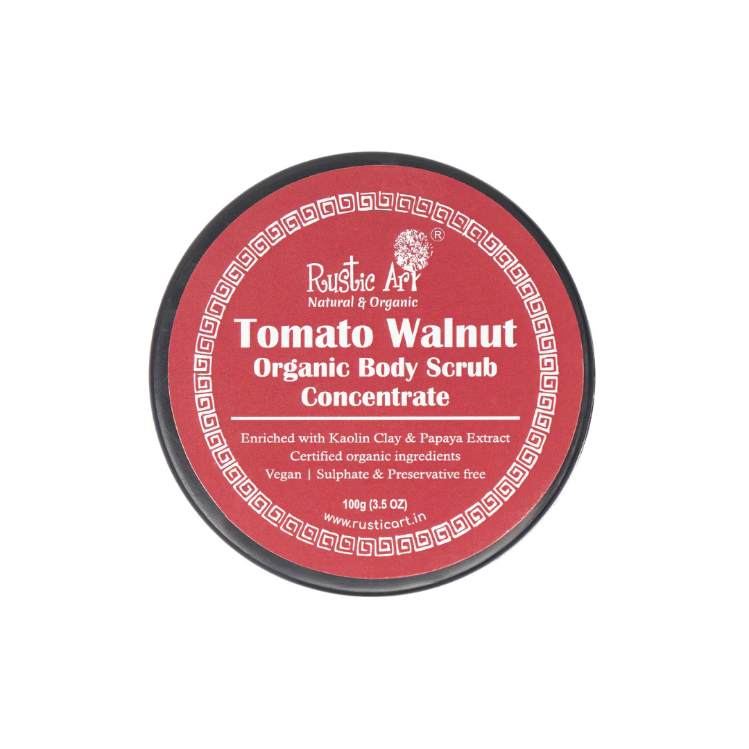 Tomato Walnut Organic Body Face Scrub Concentrate is smartly formulated to take care of all the skin types. It contains super fine soft walnut powder that scrubs without damaging the skin. Circular motion while scrubbing exfoliates and removes dead skin, unfurling soft, silky and supple skin beneath. It also results in skin polishing, removing tan, and adding a glow to the body's natural skin tone. All the oils in the formulation moisturize the skin, deep cleanse the skin's pores making the skin breathe and help fight any pigments. Fruit extracts of the body scrub ensure a proper and thorough cleaning. They create a perfect bathing environment and leave the skin soft post use. Extended use may reduce body acne, boils and uneven skin tone. The calm and soothing fragrances are a cherry on the top, that uplift your showering experience and set a perfect mood for the rest of the day; or take away day's fatigue helping you sleep peacefully!