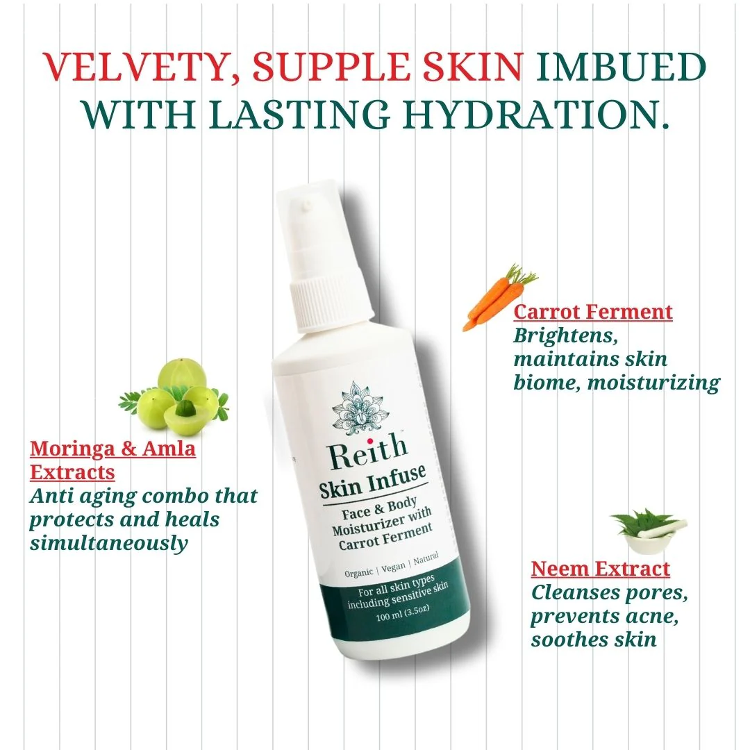 Hydration & Nourishment: Reith Skin Infuse Moisturizer, enriched with Carrot Ferment, Neem, and Moringa, provides deep hydration and nourishment for your skin.